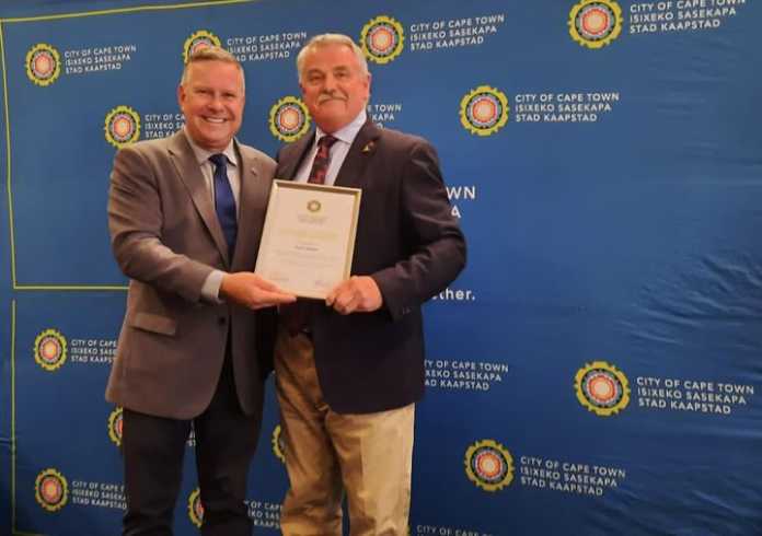 Kevin also works hard to fundraise and assist in the upkeep of many war-based memorials, statues and Cenotaph in the City of Cape Town and it is for these many years of altruism, and of honouring others that today I’m honoured to award Kevin this recognition.