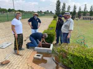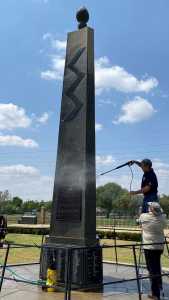The team, lead by National Chairman Gnr Niel Wiid, donned their masks and set about cleaning the Memorial, the “dwarf” walls, lectern, signboards, and all the guns. Although the grass was neatly cut by the garden service, 6 black plastic bags of weeds and a limited amount of litter were removed. Gnr Diederiks of Sandfontein Artillery Regiment identified the source of a water leak which will be repaired in the following week.