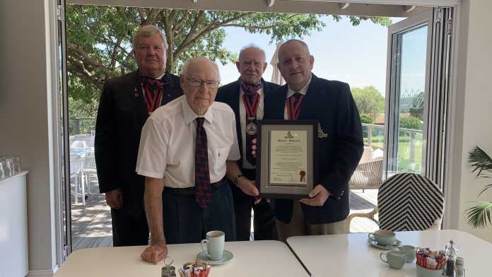 Over 60 years later, Gunner Clyde enjoyed chatting with fellow resident of San Sereno Retirement Village, Major General Roy Andersen, himself an esteemed Gunner and National President of the Gunners’ Association of South Africa. Gunner Roy realized that Gunner Clyde has not been invested into the Octogenarian Order of the Gunners’ Association. Their chat resulted in Clyde being presented with a framed certificate honouring him with as a member of the Octogenarian Order of the Gunners’ Association of South Africa.